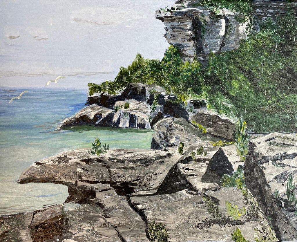 This scene is from the shoreline of the upper Saugeen Bruce Peninsula. A friend loved the painting so much she was determined to purchase it for $190. This acrylic painting was created with brush and pallet knife.