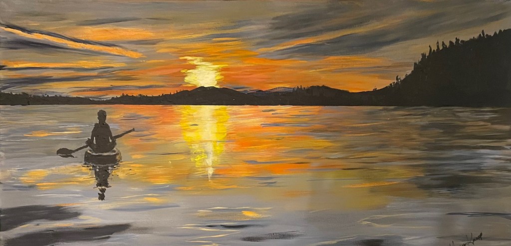This painting was gifted to my son out west. The scene is one taken on a boat trip the family took somewhere between Victoria and the Mainland. Our grandson is sitting on an inflatable paddleboard watching and taking in the sun set.
