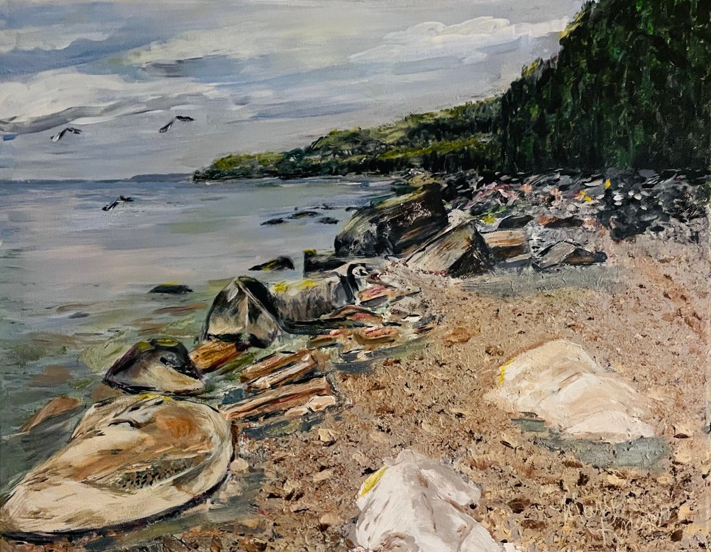 Challenging Descent: Acrylic on 18 x 24 inch canvas using brush, sponge and minimal pallet knife. It was a difficult descent down to the water after leaving the newly build steps by the Barrow Bay Trail. The painting itself was a challenge. It took several attempts to get the shape and curves of the large rocks in the bottom half to look as I wanted it to. Acrylic paint gives me the opportunity to use brush strokes to help depict roundedness.