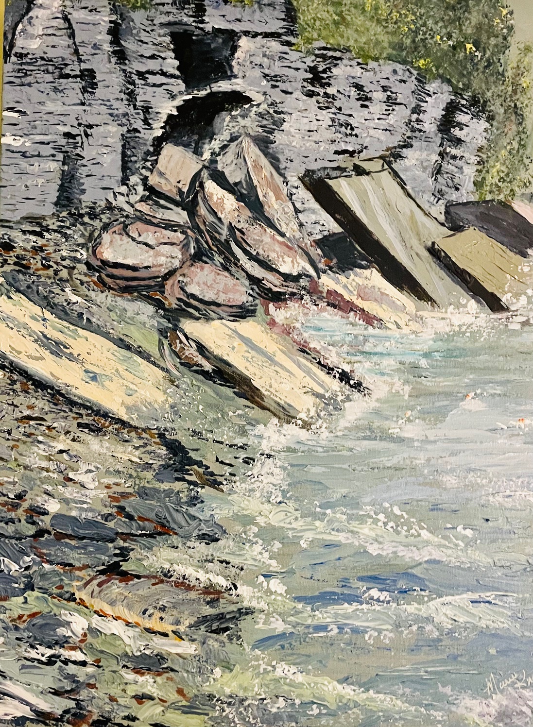Rushing Waters: Almost mono-chromatic acrylic painting using mostly pallet knife on 18 x 24 canvas. This painting will be shown and for sale at the Bruce Peninsula Art Show at the Lion’s Head High School on the August long weekend. This is the painting that nudged me to use a pallet knife and I loved it. This section of rock changes somewhat as the water level rises and drops in a cyclic pattern. It lies to the south of Rush cove. $190