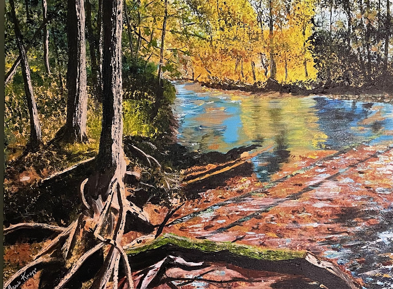 I find a sense of peace and spirituality connecting with nature. You will find most of my paintings include at least two of trees, rocks and water. I easily meditating in such venues and try to bring that state of connection with all life to what I create.